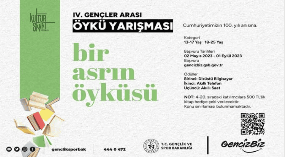 2) “Bir Asrın Öyküsü” sloganıyla gerçekleştirilecek “IV. Gençler Arası Öykü Yarışması” Cumhuriyetimizin 100. yılına ithafen düzenlenecektir. Yarışma kapsamında yazılacak eserlerde herhangi bir konu sınırlaması bulunmamaktadır.