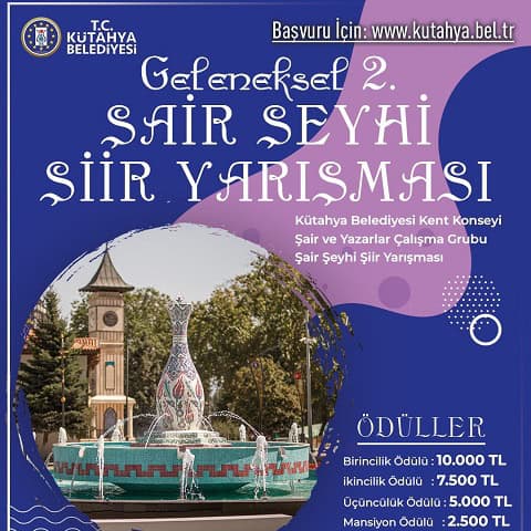 (Ödüllü)Şair Şeyhi Şiir Yarışması KütahyaBelediyesi Şair Şeyhi Şiir Yarışması düzenliyor. KatılımKoşulları: Yarışmaya Türkiye genelinden 18 yaş üzeri herkes katılabilir. Seçici Kurul Üyeleri, Yarışmayı düzenleyen kurum çalışanları ve birinci derecede yakınla...